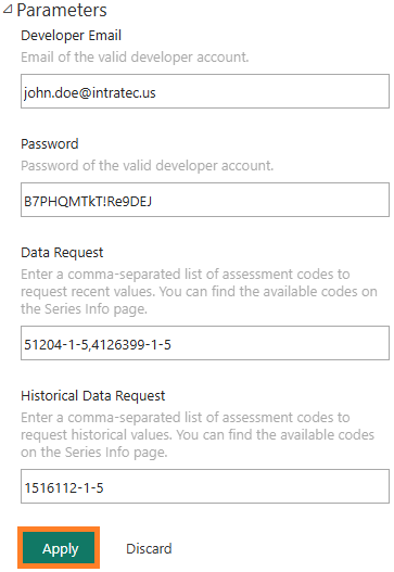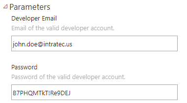 3. Under Parameters, fill the credentials with a valid Developer account's Email and Password.