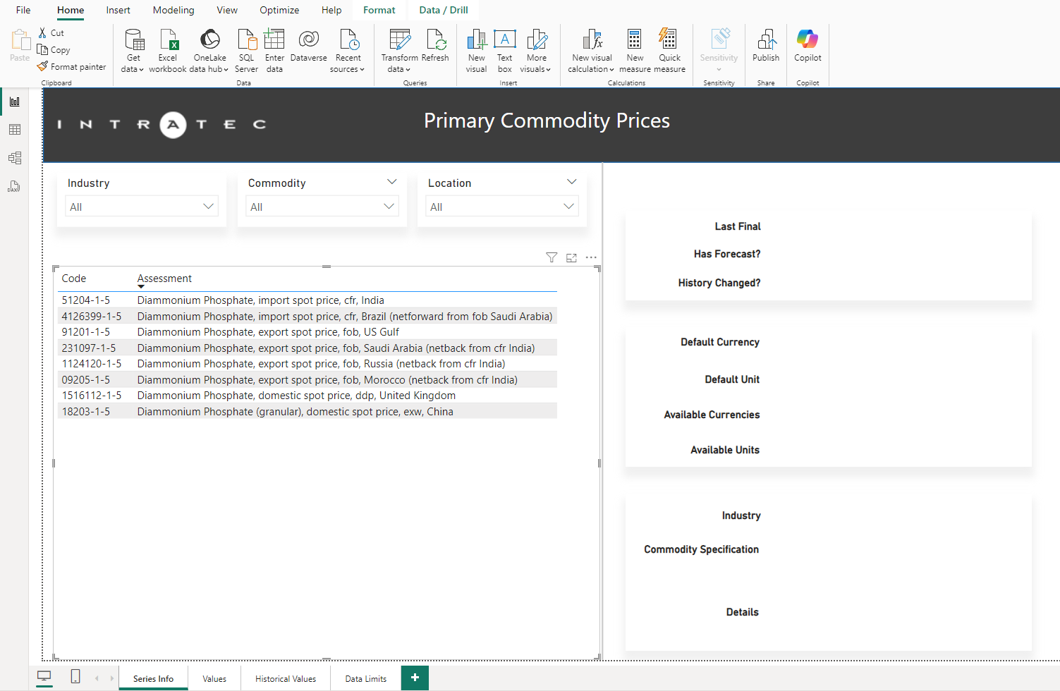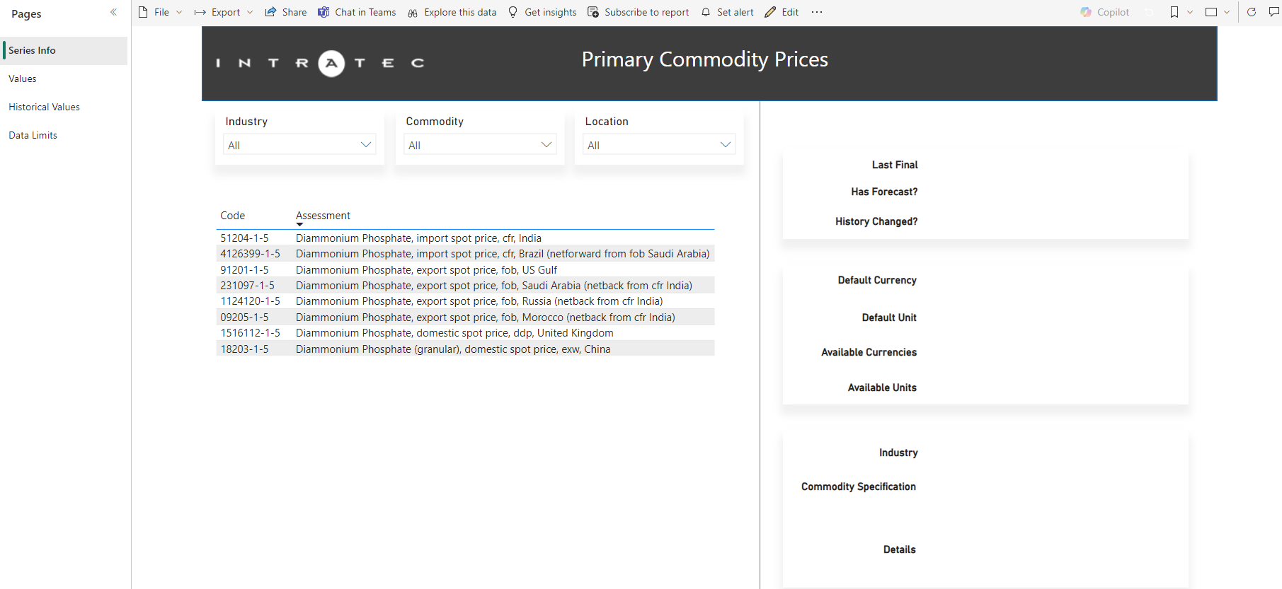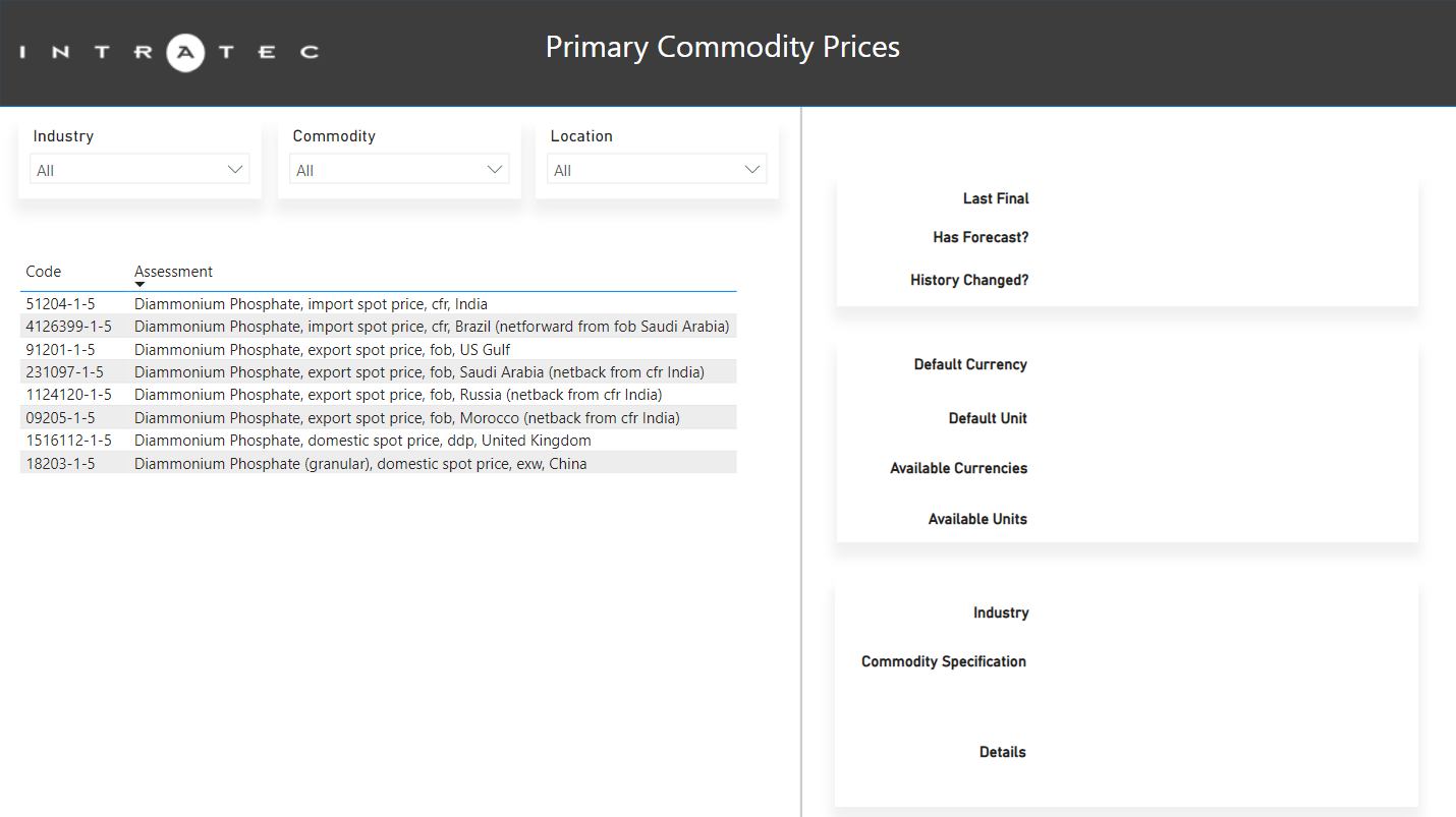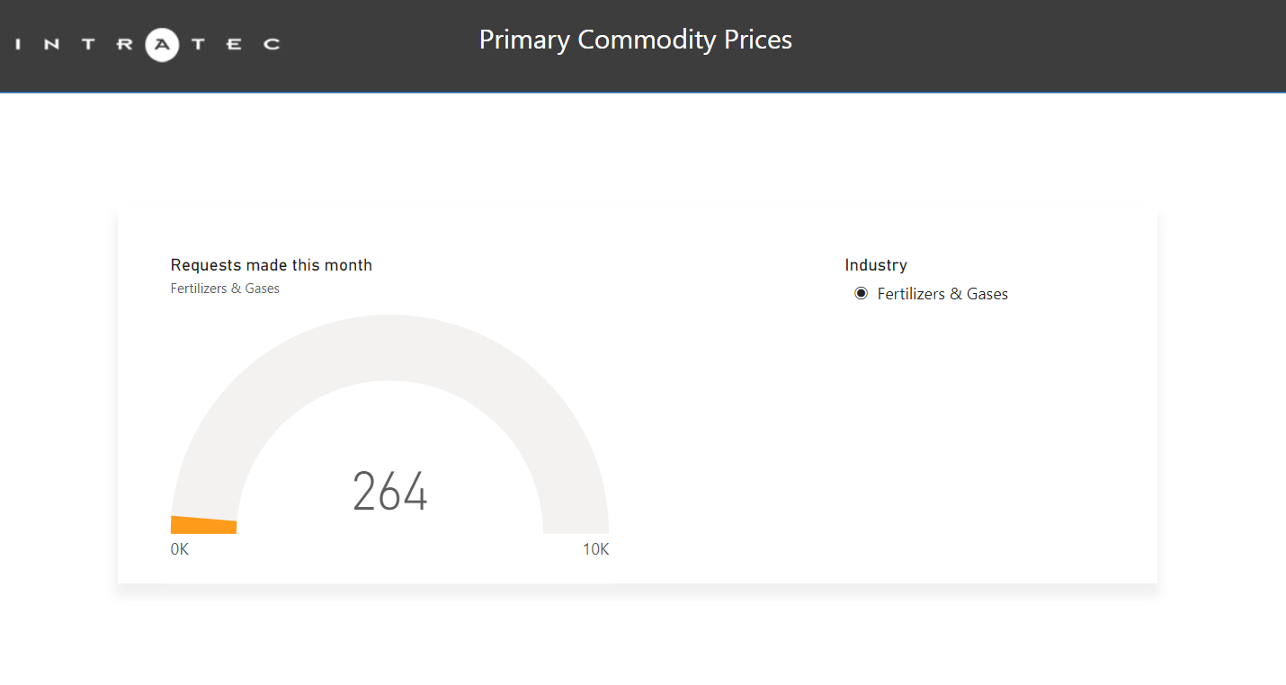The Intratec Primary Commodity Prices Power BI Dashboard is a pre-configured, open-source project file (.pbix) that provides straightforward access to Intratec Primary Commodity Prices data. It can be used as a starting point for experienced users to develop more complex applications or as a ready-to-use simple dashboard for those in need of an easy way to access the data provided by Intratec.