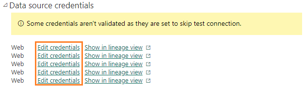1. Under Data source credentials, click on each of the Edit credentials buttons next to Web.