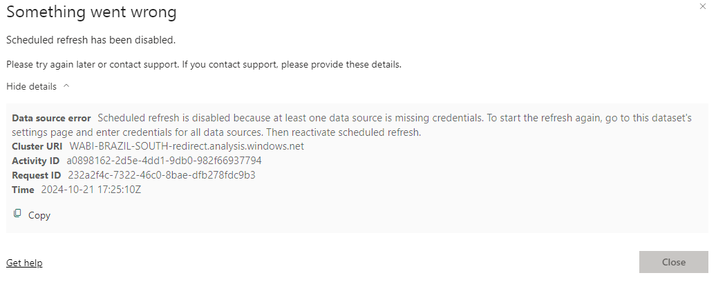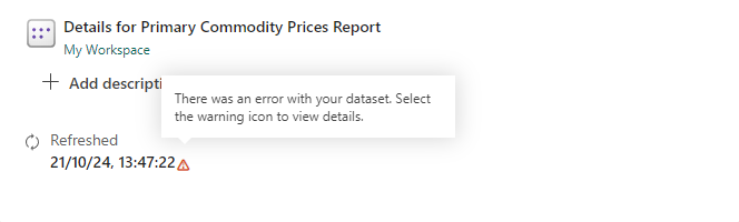 If there is anything wrong with the request, a warning symbol will appear next to the date and time of the last attempt to refresh the dataset: