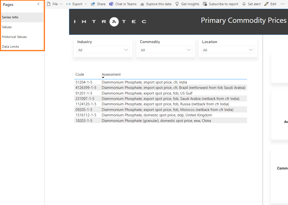 The Intratec Primary Commodity Prices Power BI Dashboard is divided into pages, which can be navigated through the left bar on Power BI online, as shown in the screenshot below.