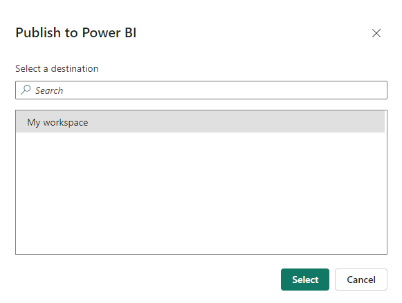 1. Select a private workspace to publish the dashboard, click Select, and wait for it to load.