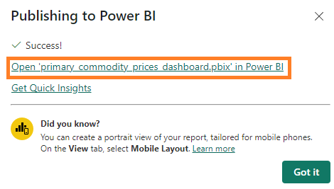 1. Click on Open 'primary_commodity_prices_dashboard.pbix' in Power BI to access it in the web browser.